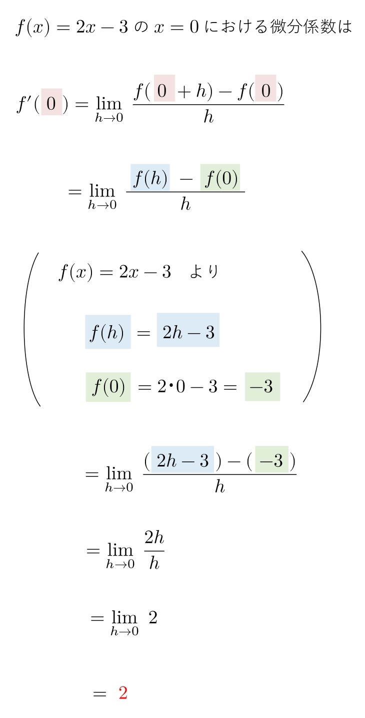 問題文に「定義に従って微分係数を求めよ」と書かれていたら、このように解きます。